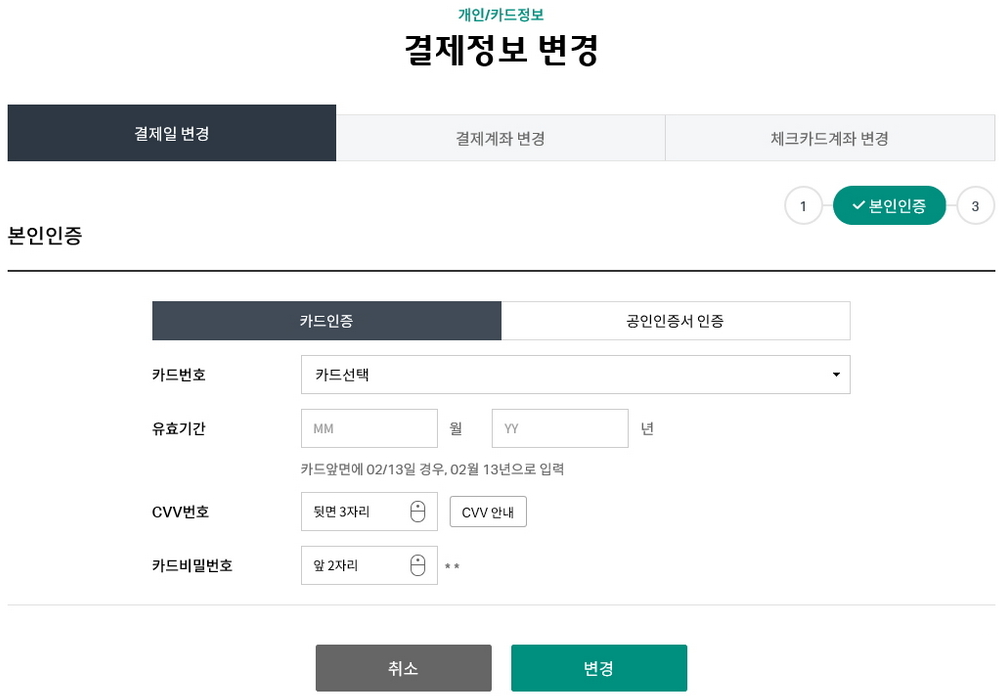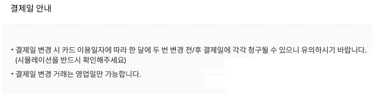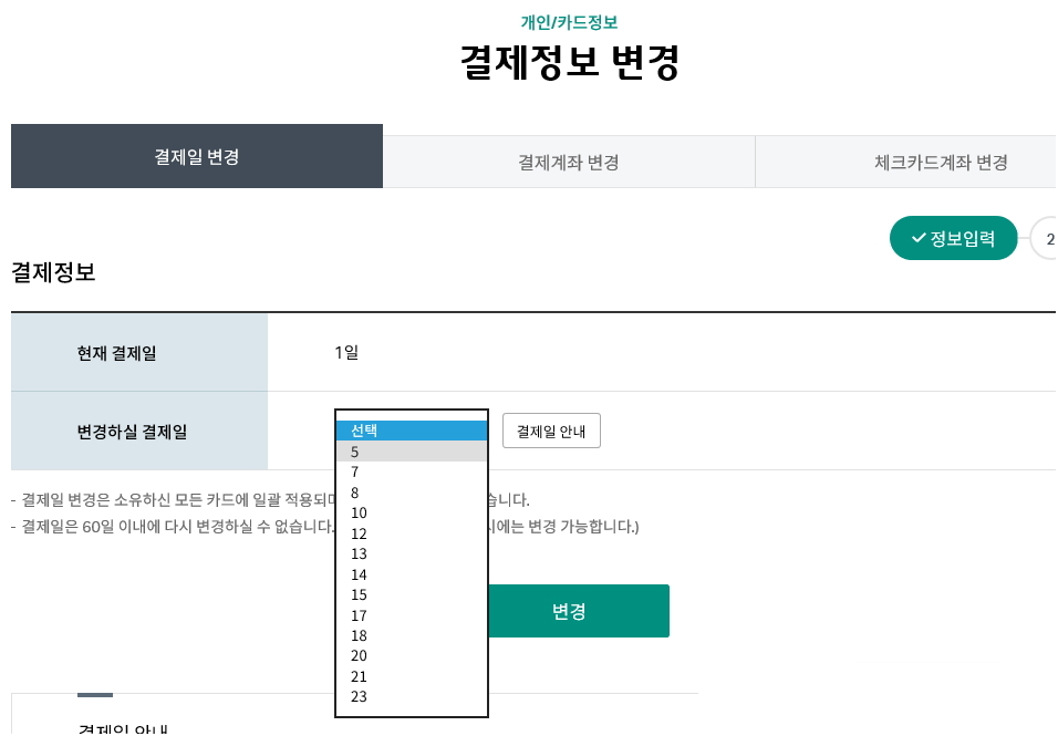 현재 결제일을 확인 하신다음 변경하실 결제일을 선택해주세요. 결제일 변경은 소유하신 모든 카드에 일괄 적용되며결제일은 60일 이내에 다시 변경하실 수 없습니다