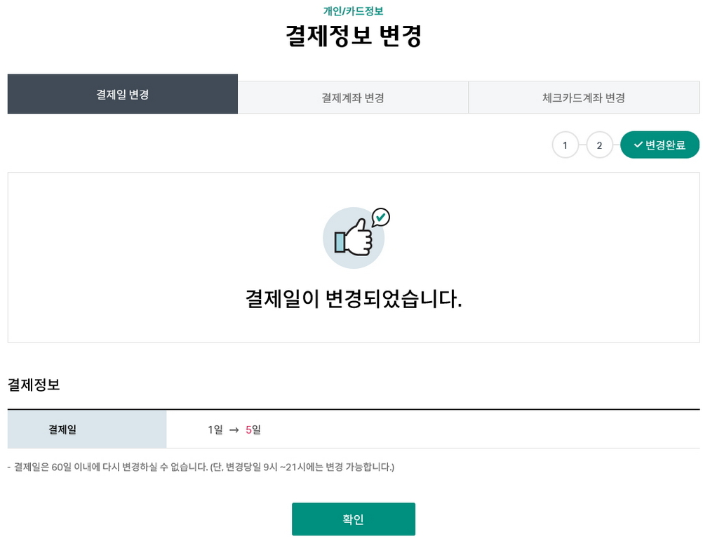하나카드 결제일이 변경되었습니다. 1일에서 5일로 변경을 했습니다. 앞서 말씀드린 것과 같이 결제일은 60일 이내에 변경이 불가능합니다. 다만 당일 9~21시 사이에는 변경이 가능하니 다시 변경하고 싶으신 분은 변경 신청을 하시면 되겠습니다.
