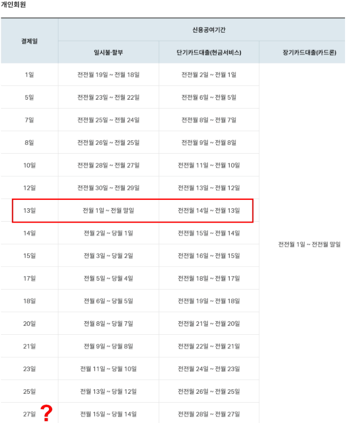 신용카드 결제금액을 편하게 관리하기 위해서는 매월 1일부터 말일까지 신용카드 사용금액을 다음달에 결제하고 싶으시면 13일로 결제일을 설정해주세요. 다른 카드회사 같은경우는 대부분 14일인데 이 부분도 조금 차이가 있습니다. 물론 일시불·할부와 단기카드대금(현금서비스)는 신용공여 기간이 다르기 때문에 주의를 하셔야 합니다.