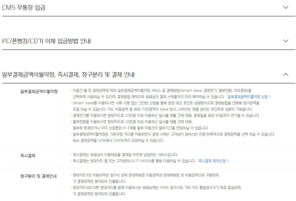 자동이체 신청이나 변경은 거래은행이나 현대카드 홈페이지 본점이나 지점에서 신청이 가능하며, CMS 자동이체는 현대카드로 신청했을 때 결제일 4일 전까지 신청해야 합니다.