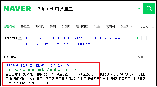 먼저 네이버 검색창에 "3dp net 다운로드" 라고 검색하시면 아래 화면과 같이 목록이 뜰겁니다. "3DP Net 최신버전 다운로드 - 공식 웹사이트"라는 링크가 있는데 접속을 해주세요.※하단에 드롭박스형식으로 접속 링크를 걸어두었습니다.