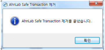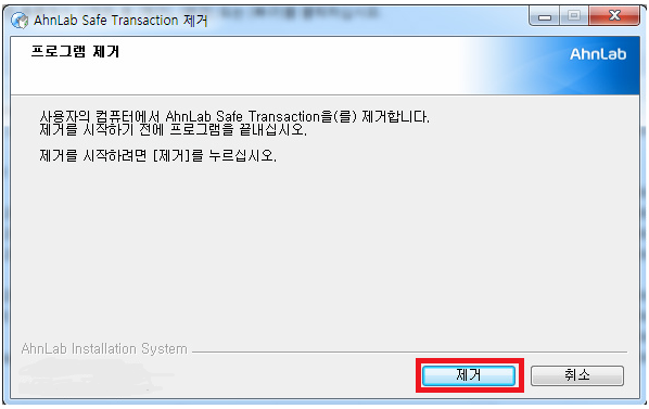Ahnlab Safe Transaction 제거 창이 나타나면 하단에 "제거" 버튼을 통해서 삭제를 진행해주세요.