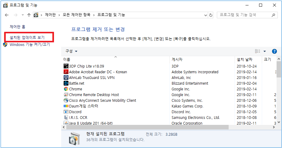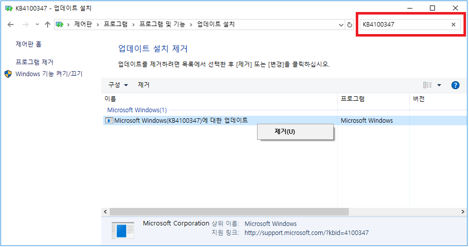 오른쪽 상단에 있는 검색란에 "KB4100347"를 입력하고 검색하신 후 마우스 우측 버튼을 사용해서 제거를 해주세요.