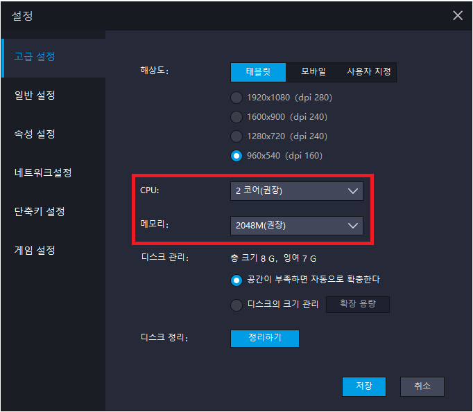 설정창에 들어가시면 고급설정, 일반 설정, 속성 설정, 네트워크 설정, 단축키 설정, 게임 설정 등을 할 수 있는 메뉴들이 있습니다. 여기에서 고급설정에 본인의 컴퓨터 사양에 맞게 CPU 코어수와메모리 크기를 조절해주세요.