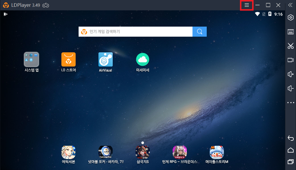 LD 플레이어 프로그램을 실행하셨다면 오른쪽 상단에 있는 "메뉴"버튼을 선택하신 후 "설정"을 들어가 주세요.