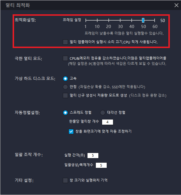 (최적화 설정→ 프레임 설정 항목)의 프레임 수를 낮게 조절하신 후 "멀티 앱 플레이어 실행 시 소리 끄기, CPU 적게 사용됩니다" 체크란에 체크를 해제하신 후 "극한 멀티 모드"를 사용하시면 CPU 사용량이 감소하여 더욱 많은 멀티 플레이어를 실행하실 수 있습니다.