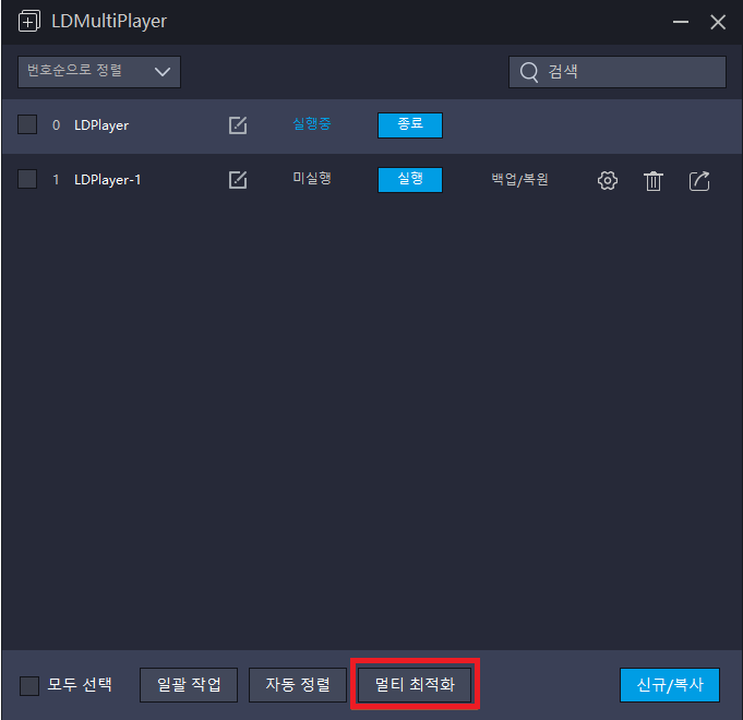LD플레이어 멀티 최적화 설정 방법은 기본 생성되는 LD 플레이어에게 영향을 끼치지 않습니다. 신규/복사를 통해서 새롭게 생성한 플레이어들에게만 적용이 됩니다. "단일 플레이어만 사용하신다면 하지 않으셔도 됩니다"LDMultiPlayer를 실행하신 다음 하단의 "멀티 최적화"버튼을 선택해주세요.