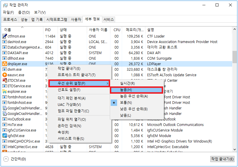 LD 플레이어 프로세스를 다른 프로세스들보다 리소스에 접근하는 우선순위를 높여주면 성능이 향상됩니다. (CTRL + SHIFT + ESC)를 입력하시면 작업 관리자가 열립니다. 여기서 세부 정보 탭으로 이동하신 후 "dnplayer.exe" 프로세스를 마우스 우측 버튼으로 선택하신 후 (우선순위 설정 → 높음)을 선택해주세요. 더 쾌적한 환경을 원하신다면 LD 플레이어를 실행하시기 전"백신 프로그램, 가상화 프로그램"을 먼저 종료해주세요.