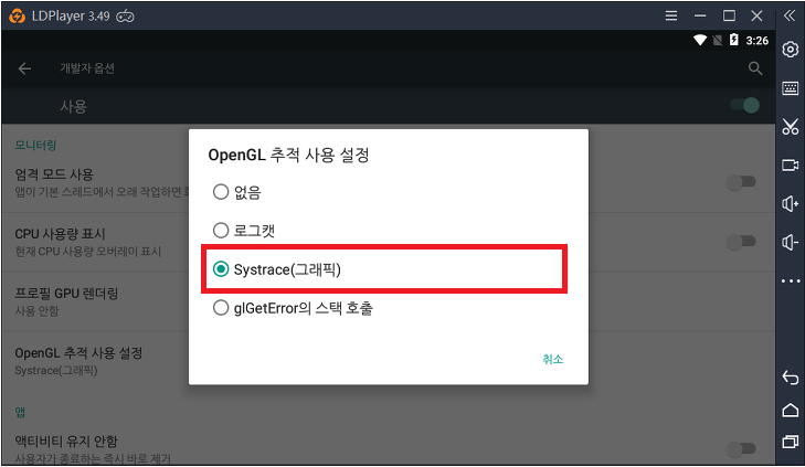 그리고 다시 하단으로 드래그한 후 (모니터링 → OpenGL 추적 사용 설정)을 선택하고 Systrace(그래픽) 항목을 선택해주세요.