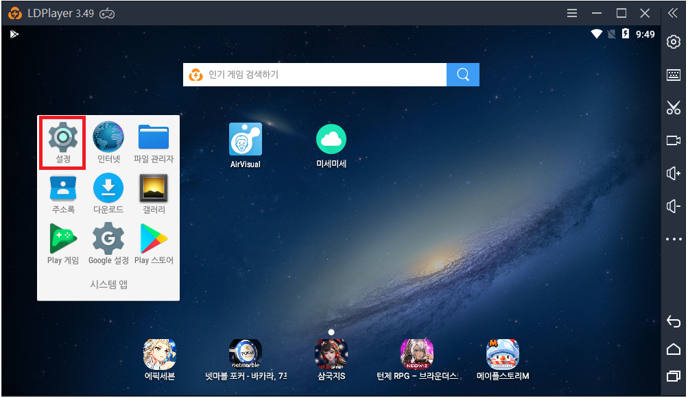안드로이드 개발자 옵션에서 그래픽카드의 GPU를 이용한 하드웨어 가속 설정 등의 시스템 설정이 가능합니다. LD플레이어 프로그램을 실행하신 후 홈 화면에서 (시스템 앱 → 설정)을 선택해주세요.