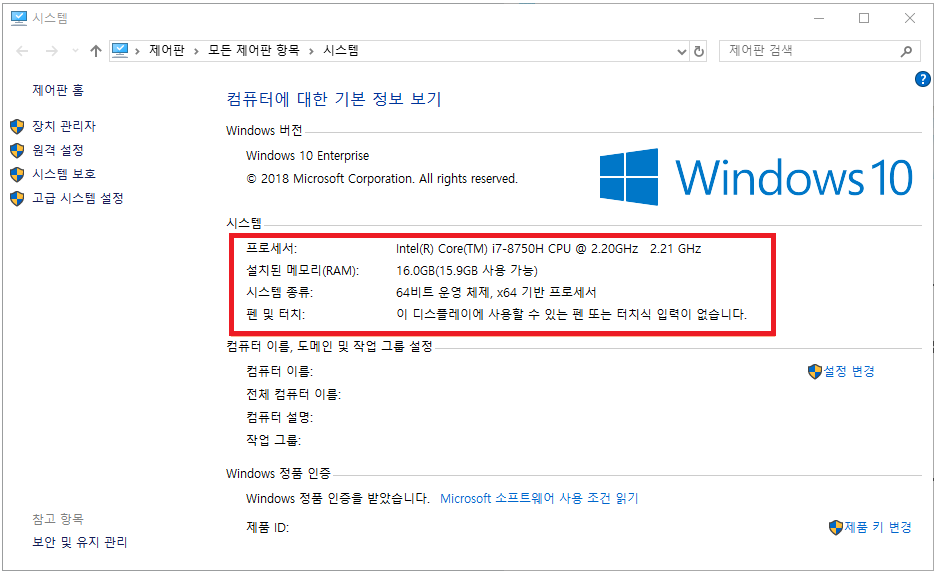 본인의 컴퓨터 사양을 잘 모르신다면 바탕화면에 있는 내 컴퓨터를 마우스 우측 버튼을 통해서 속성을 선택하시면 본인의 컴퓨터 사양을 확인하실 수 있습니다. CPU는 본인의 컴퓨터에 장착된 CPU 코어의 절반 정도만 설정해주시고 메모리는 4GB로 설정해주시면 됩니다.(설치된 메모리가 4GB라면 2GB로 설정해주시면 됩니다.)