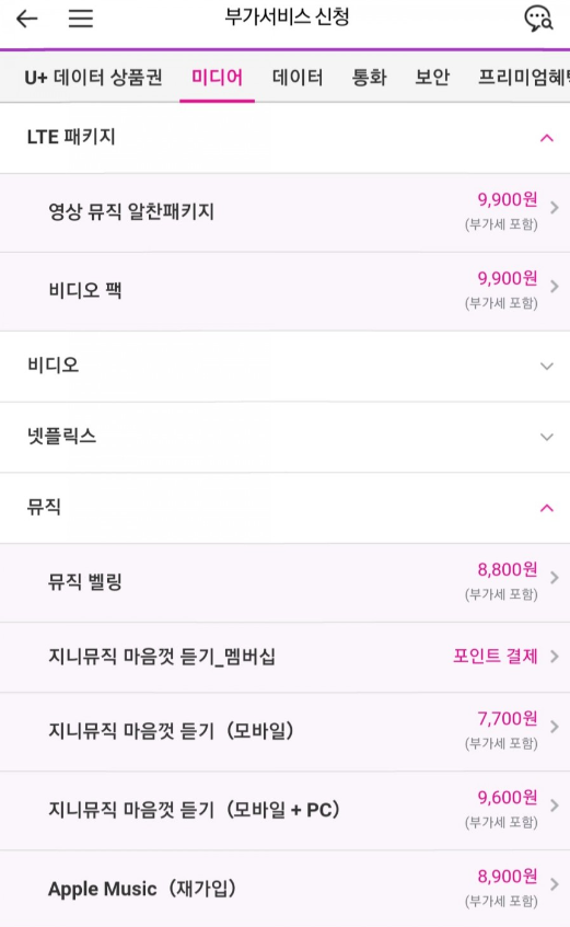 안녕하세요. 오늘은 LG U플러스 지니뮤직에 대해서 알아보겠습니다. 지니뮤직을 새로 가입하시는 분들은 최초 1회 할인을 받을 수 있더라구요. 멤버십 포인트를 사용해서 이용권30%를 할인받을 수 있는데요. 그럼 알아보겠습니다. 먼저 LG U플러스 통신사 어플을 열어주신 후 부가서비스 신청 에서 "미니어" 항목을 선택하시면 지니뮤직 요금제를 확인하실 수 있습니다.