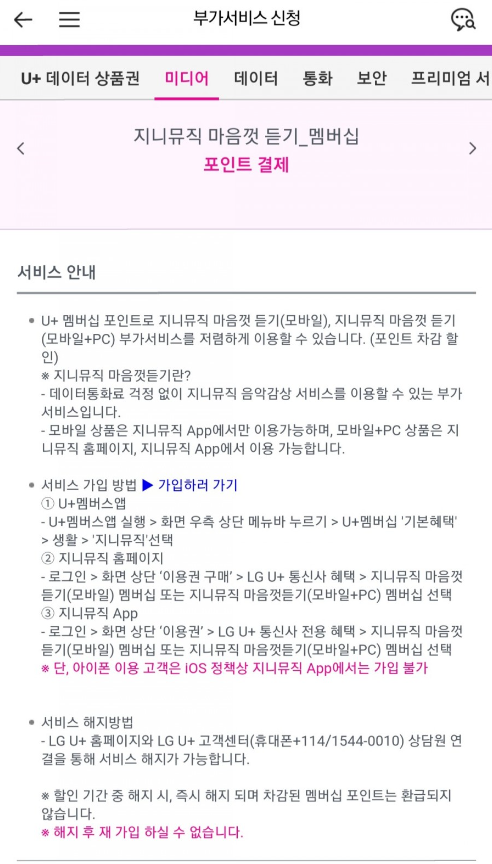 제가 가입하고있는 "지니뮤직 마음껏 듣기"는 최초 가입 후 6개월간 할인금액을 멤버십 포인트를 차감하신 후에 이용이 가능합니다.