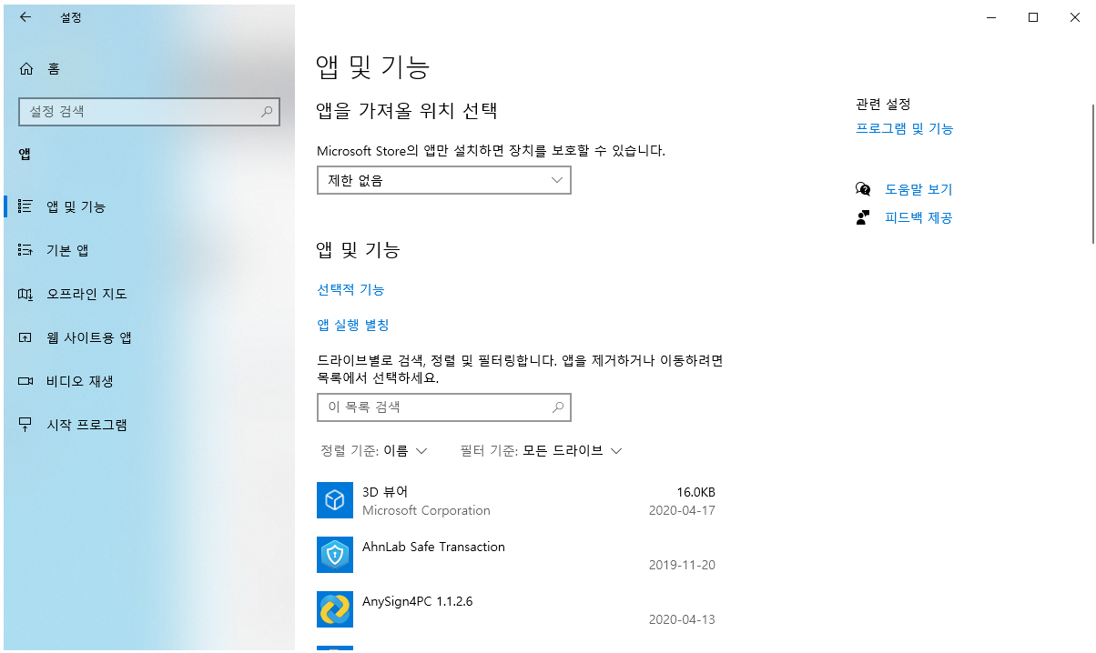 "앱 및 기능" 창에서 MagicLine4NX 를 찾아서 삭제 및 제거를 해주시면 됩니다.