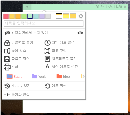 상단 메뉴에서는 메모장의 색상도 변경하실 수 있으며 비밀번호를 설정하거나, 타이머 설정, 파일 또는 워드패드로 내용 변환 등 다양한 기능을 사용해보실 수 있습니다.