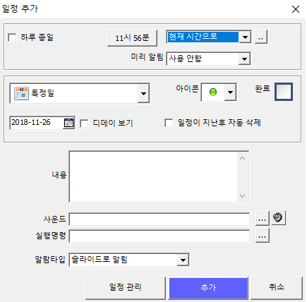 일정이나 기념일의 경우는 특정 날짜나 시간을 적어주시면 되고, 내용이나 알람 타입 등 자세한 설정도 변경해 볼 수 있습니다.