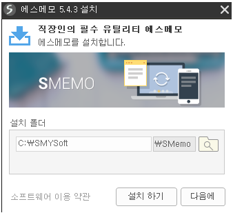 S메모 설치 창이 나타나면 설치 폴더를 지정하는 창이 나오는데, 다른 경로를 지정하시려면 지정 경로를 선택해주시고그냥 설치하시려면 설치하기 버튼을 꾸욱!! 해주세요.