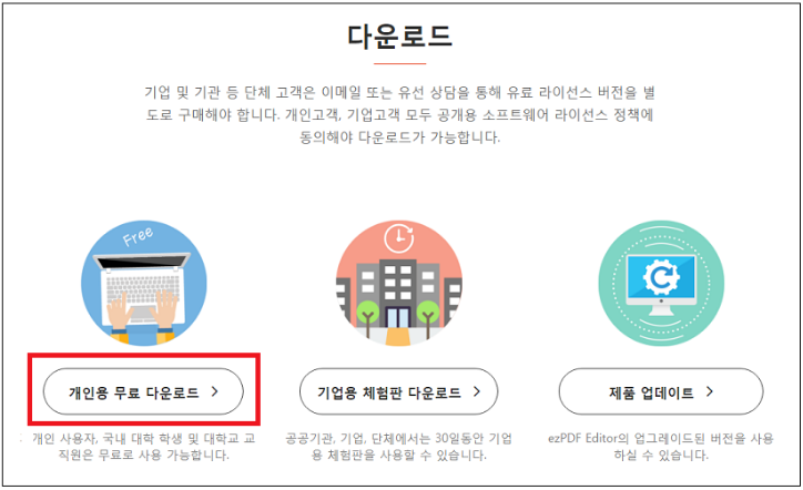 ezPDF Editor 3.0 다운로드 페이지가 뜨면 개인용과 기업용으로 나눠서 다운받을 수 있습니다. (기업용은 라이센스를 구매해서 사용해야 합니다)