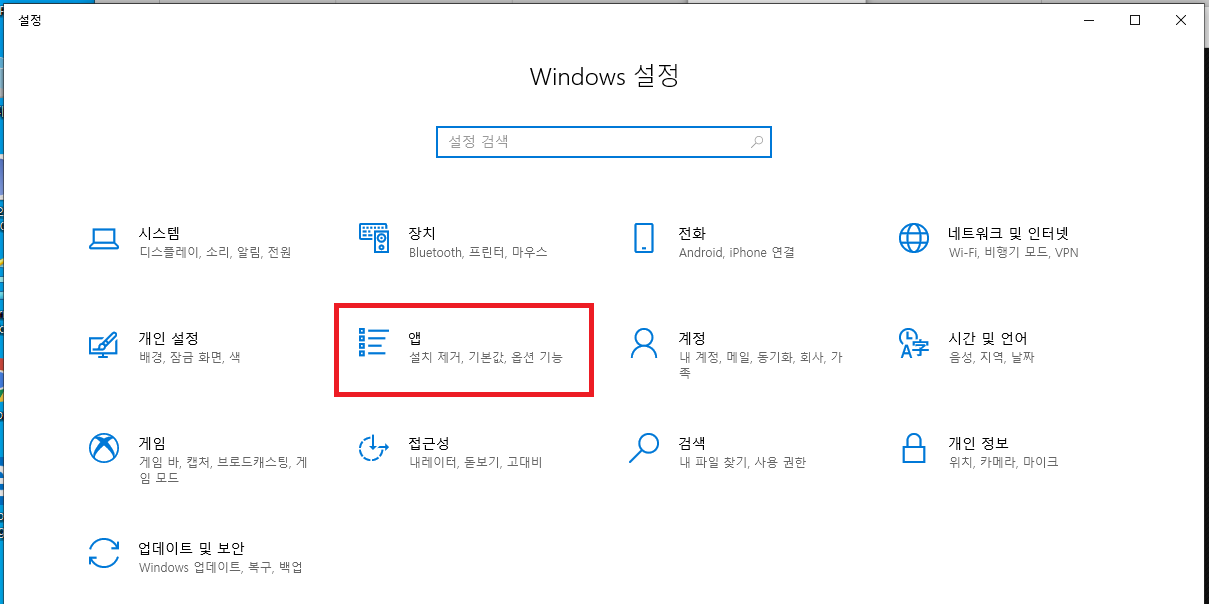 윈도 + i 키를 눌러서 윈도우 설정창을 들어가 주시고여기서 "앱"으로 들어가 주세요.