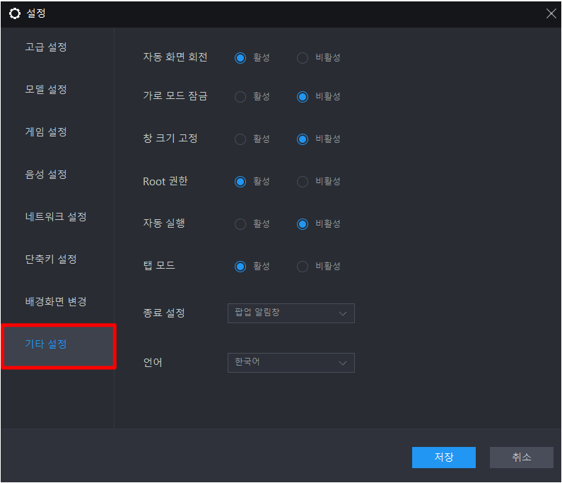 이번엔 기타 설정에 대해서 알아보겠습니다. 자동 화면 회전, 가로 모드 잠금, 창 크기 고정, Root 권한, 자동 실행,  탭 모드, 종료 설정, 언어 등의 일반적인 설정을 하실 수 있습니다. 만약에 창 크기를 본인이 지정한 크기로 고정을 하고 싶다면 "활성"에 체크를 하시면됩니다.