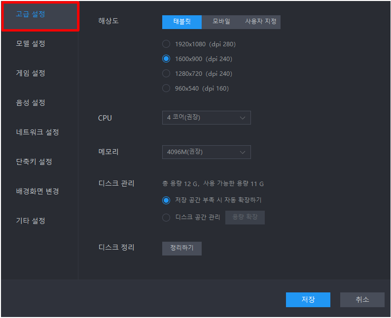 그러면 이렇게 설정창이 나타납니다. 본인의 컴퓨터 사양에 맞게 설정을 해주시면 되는데요.먼저 고급설정을 통해서 해상도와 사양을 조절하실 수 있습니다. 1600x900 해상도가 가장 이상적이며 추후 다른 해상도로 변경하셔도 됩니다. 그리고 CPU와 메모리의 경우 내 컴퓨터 사양에 맞게 설정해주시면 됩니다.