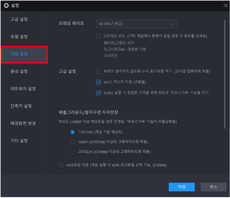 게임 설정에 대해서 알아보겠습니다. 프레임 레이트는 60 FPS 기본값으로 설정이 되어있습니다. 본인의 컴퓨터 사양이 좋고 사양이 높은 모바일 게임을 하게 되면 고프레임 모드에 체크를 하시면 됩니다. 예를 들어 배틀그라운드를 하시는 유저라면 배틀그라운드/절지 구생 자극전장의 해상도와 절지구생 전군 출격 해상도를 조절해주시면 됩니다.
