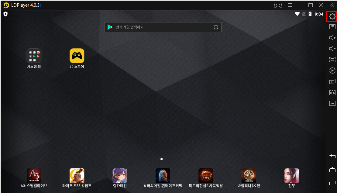 설치가 완료된 엘디 플레이어를 실행하셨다면 메인화면을 보실 수 있을 겁니다.구글 플레이스토어에 접속하신 후 본인이 즐겨하시는 모바일 게임 어플을 검색해서 설치하시면 원활 한게임들을 진행하실 수 있습니다. 그전에 최적화를 먼저 해주시는 것이 좋은데요. 본인의 컴퓨터 사양에 맞게 최적화를 해주셔야 렉 없이 게임을 할 수 있습니다. 우측 상단의 설정 아이콘을 선택해주세요.