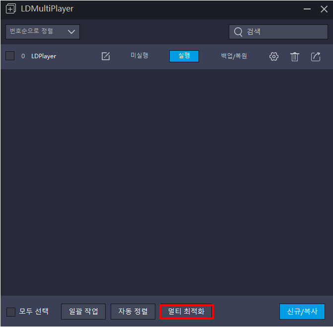 LDMultiPlayer 설정에 대해서 알아보겠습니다. 바탕화면의 LDMultiPlayer 아이콘을 선택해서 실행을 해주세요. 신규/복사에서 다중 계정을 사용하신다면 엘디 플레이어를 여러 개 실행하실 수 있습니다. 만약 멀티를 사용하신다면 멀티 최적화를 진행해주시는 것이 좋습니다.